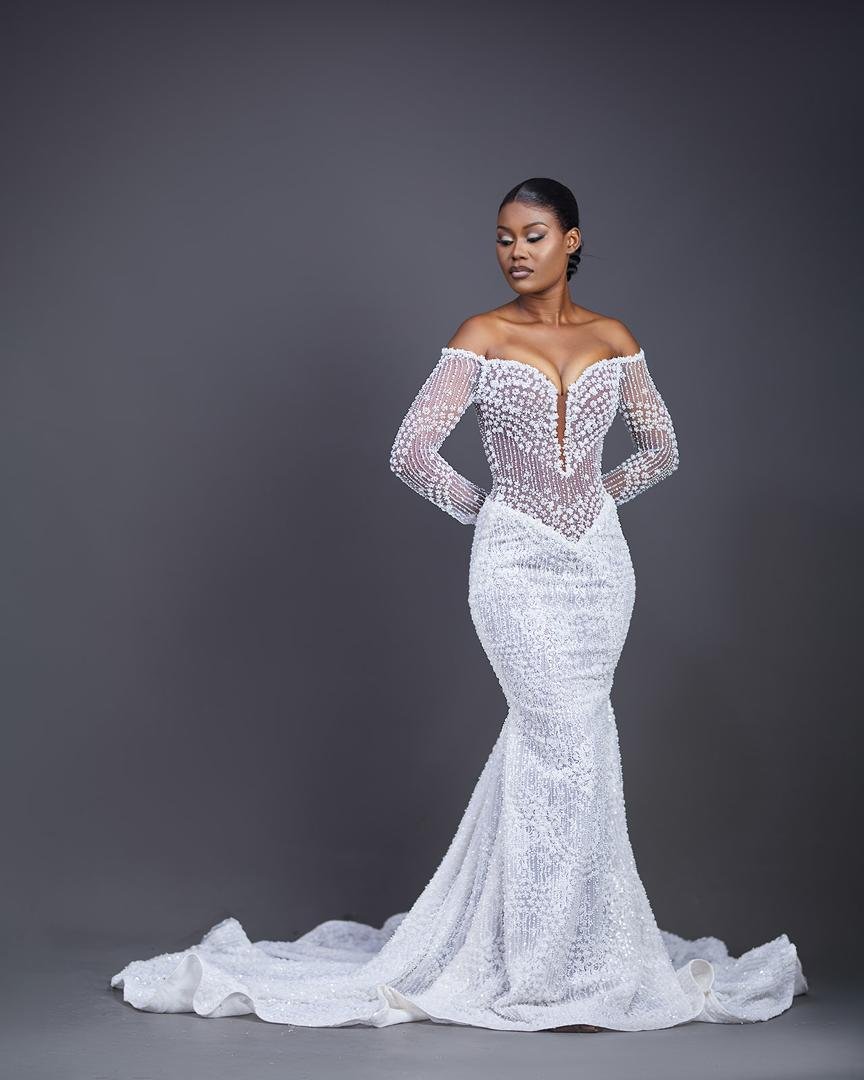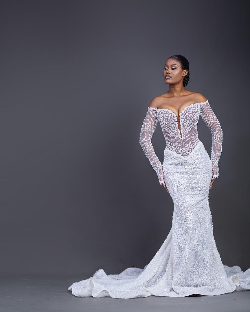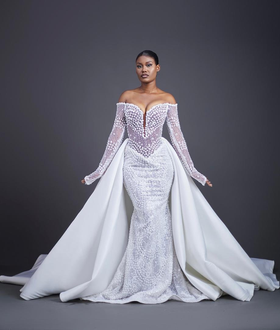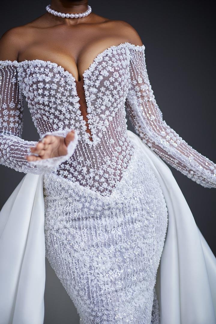 Walk down the aisle in this statement gown. The dramatic mermaid bottom and fully beaded corset give you that trendy look. The crystal and pearl beading details add glamour to the perfectly blended illusion mesh on the sleeve. The low back also adds more dimension to the gown. It’s the gown that keeps giving with the many elements that blend perfectly together, creating a masterpiece.